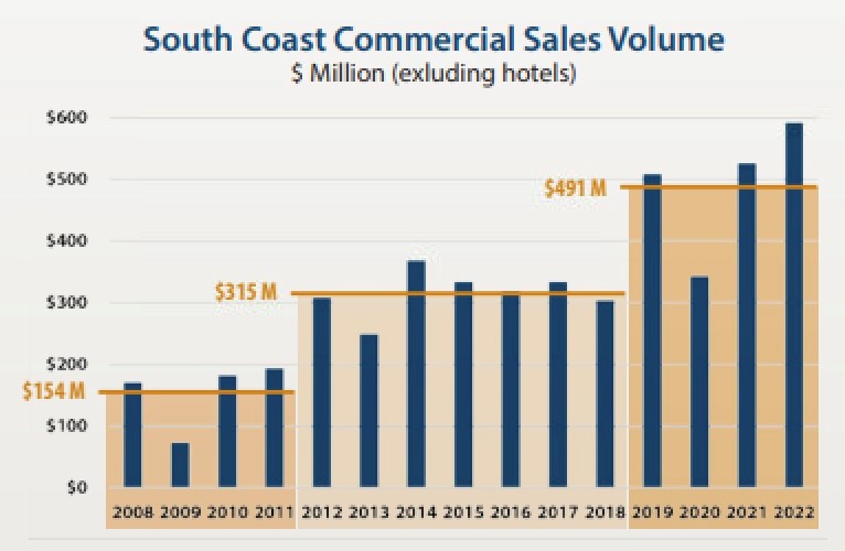 “To place this era of unprecedented sales in historical context, the graph…shows South Coast sales volume has followed a stair-stepping growth pattern with three distinct phases, starting with the “great recession” 15 years ago. The recessionary phase lasted through 2011